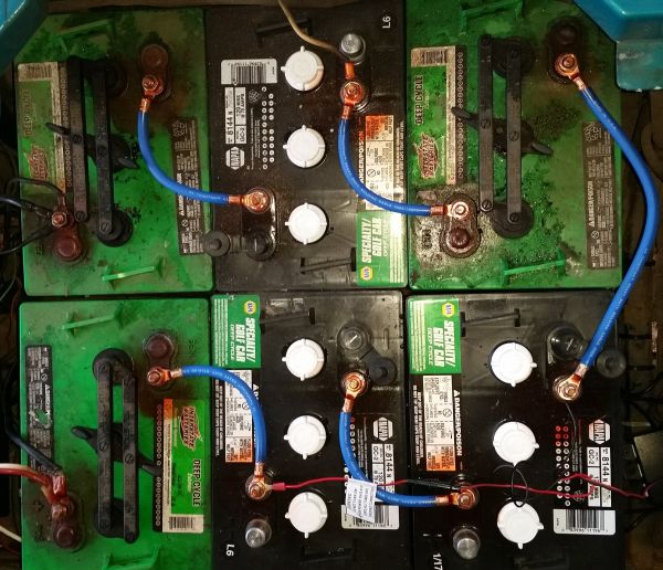 The other day I was cruising over to see the Oilman, and just as I pulled into his driveway, my cart died. The batteries still had a good charge, so I couldn't figure out what could be happening. The Oilman and I pushed it up into the driveway, and I did my standard diagnostic procedure... I started jiggling things. I noticed that when I wiggled one of the wires, I'd see the battery level on the dash flash. When I hit each individual battery with a meter, they were each over 6 volts. Going from the start of the series to the end, however, I was getting all sorts of weird readings.